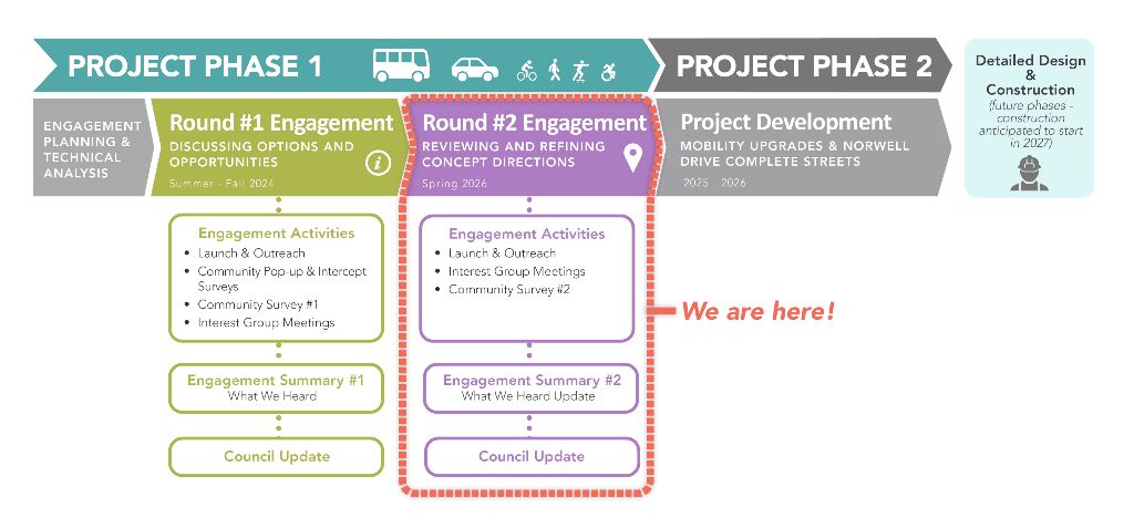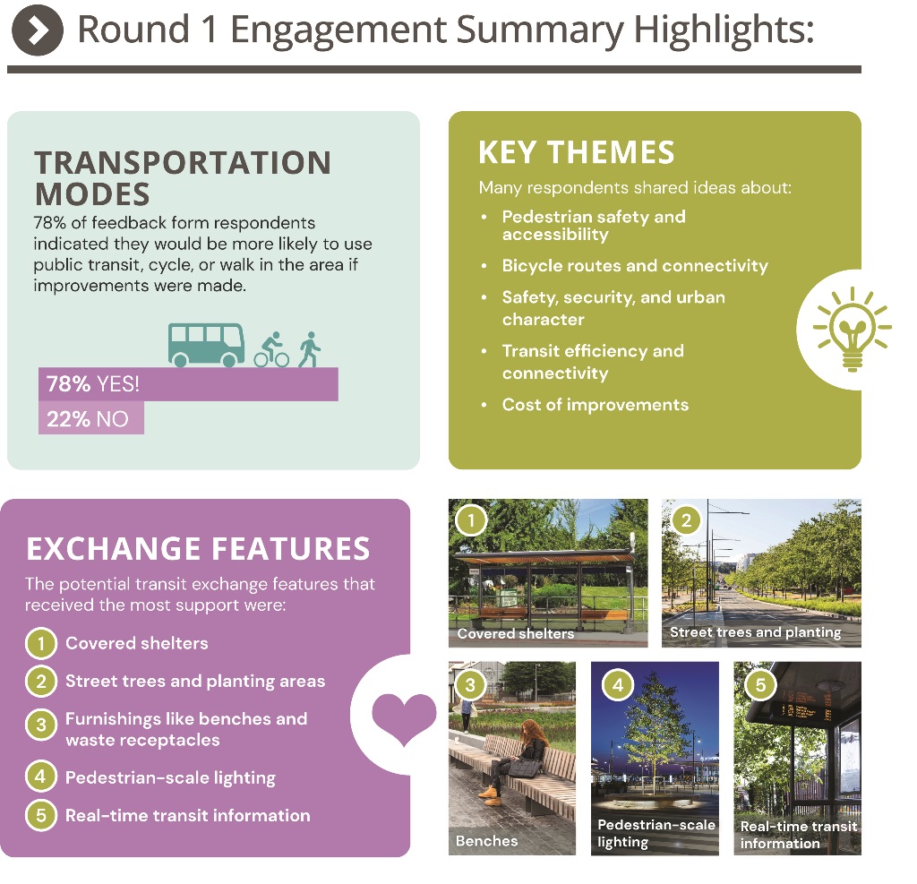 Your input will help refine the plan for the transit exchange and surface upgrades. Stay tuned for a Round 2 Engagement Summary and announcements regarding next steps in the process.