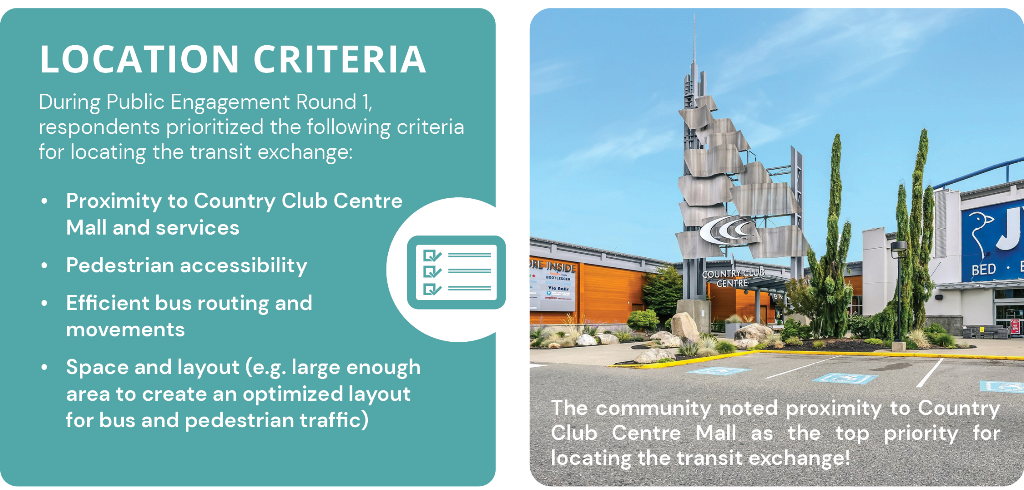 During the first round of community engagement we received input regarding issues and opportunities to create a safer transit exchange with better access to Country Club Centre Mall. Common themes are summarized below. Please refer to the Round 1 Community Engagement Summary for more details.
