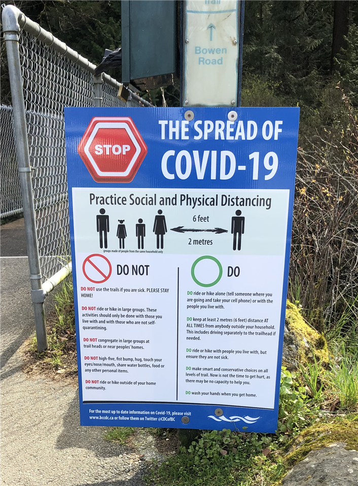 To help remind citizens of this important practice, signs have been produced and have been installed in parks and at trailheads. These signs provide a list of "do's" and don'ts" while recreating in the outdoors, including using these areas only if you are healthy and without any symptoms of the virus.