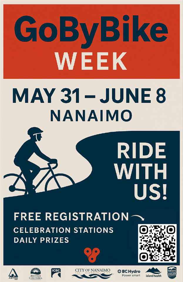 GoByBike Week is back from May 31 to June 8, and the City of Nanaimo invites residents of all ages and cycling levels to join in the celebration of active transportation. Whether you’re biking to work, school, errands or just for fun, every pedal stroke counts toward a healthier, more sustainable city.