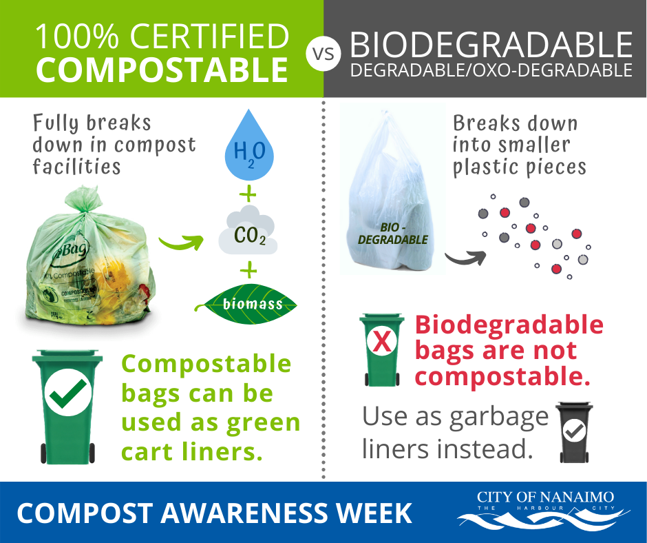 Certified Compostable bio-products are designed to fully break down into water, carbon dioxide and biomass in industrial composting facilities. Any bio-product that is not Certified Compostable is NOT guaranteed to break down fully and will stay intact or break down into smaller plastic pieces. Biodegradable and degradable products and packaging cannot go into the Green Cart, because they are likely to contaminate our compost stream with macro- or micro-plastics.