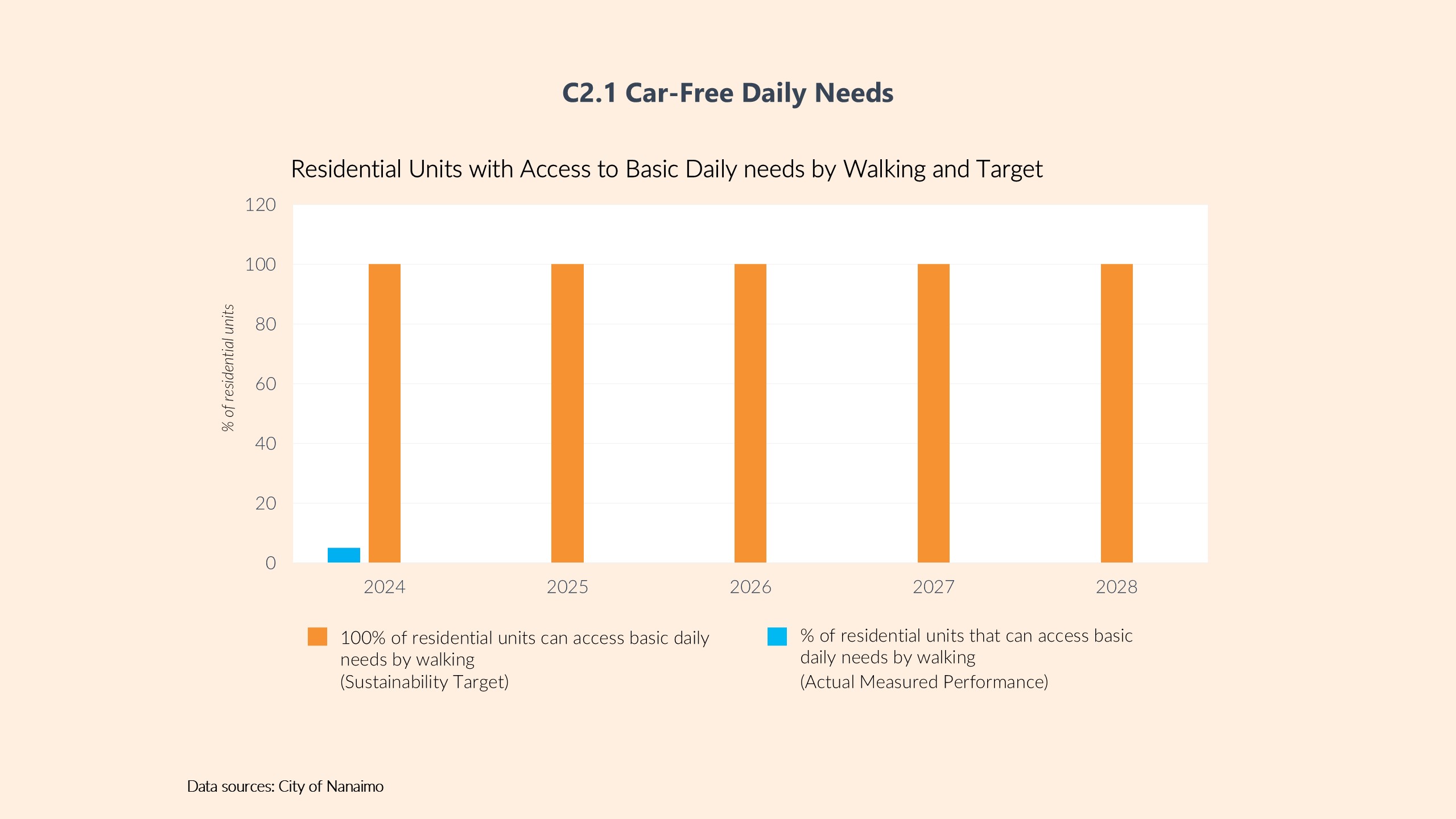 If the total percentage of residential units that can access all four basic daily needs car-free is 5% each year, then the score is 5%/100% = 5%Indicator Data