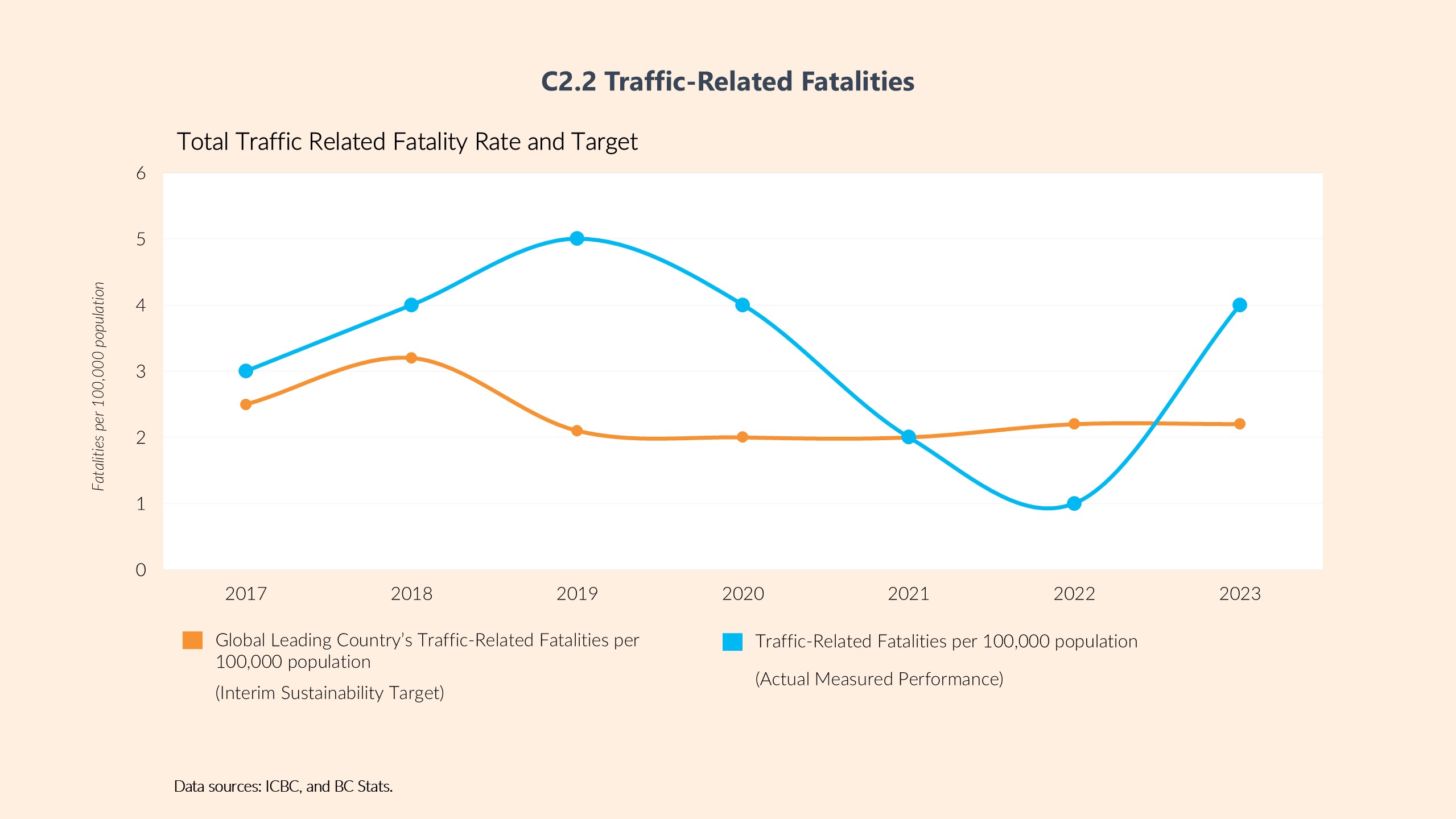 The City’s Transportation Team receives and reviews annual data on traffic-related fatalities from the Insurance Corporation of British Columbia. They set the upper limit (i.e. 0% performance score) of the traffic-related fatality rate to be 10 fatalities per 100,000 population based on their knowledge of poor performers among Canadian provinces.Give feedback on accessibility. Submit your feedback through our online accessibility feedback form. Help us understand barriers people face when accessing City services.