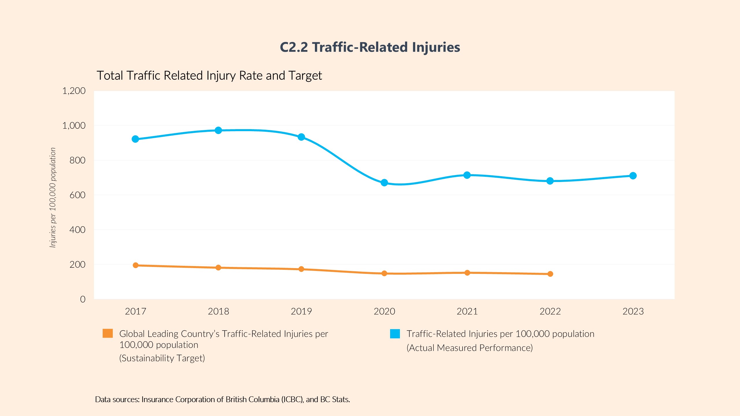 The City’s Transportation Team receives and reviews annual data on traffic-related injuries from the Insurance Corporation of British Columbia. They set the upper limit (i.e. 0% performance score) of the traffic-related injury rate to be 500 injuries per 100,000 population based on their knowledge of poor performers among Canadian provinces.Give feedback on accessibility. Submit your feedback through our online accessibility feedback form. Help us understand barriers people face when accessing City services.