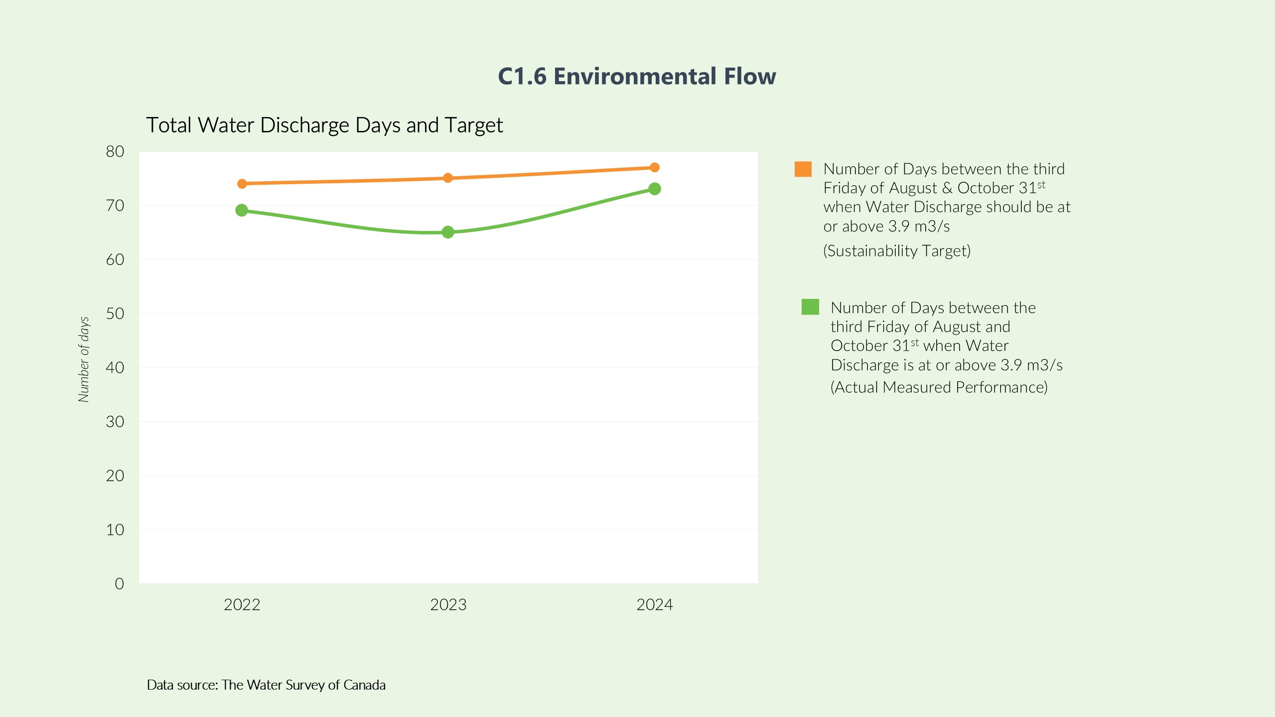 Water Survey Canada’s website publishes real-time discharge data. Annually, City Staff reviews the data and records the number of days the water discharge is at or above 3.9 m3/s between the third Friday of August and October 31 every year.