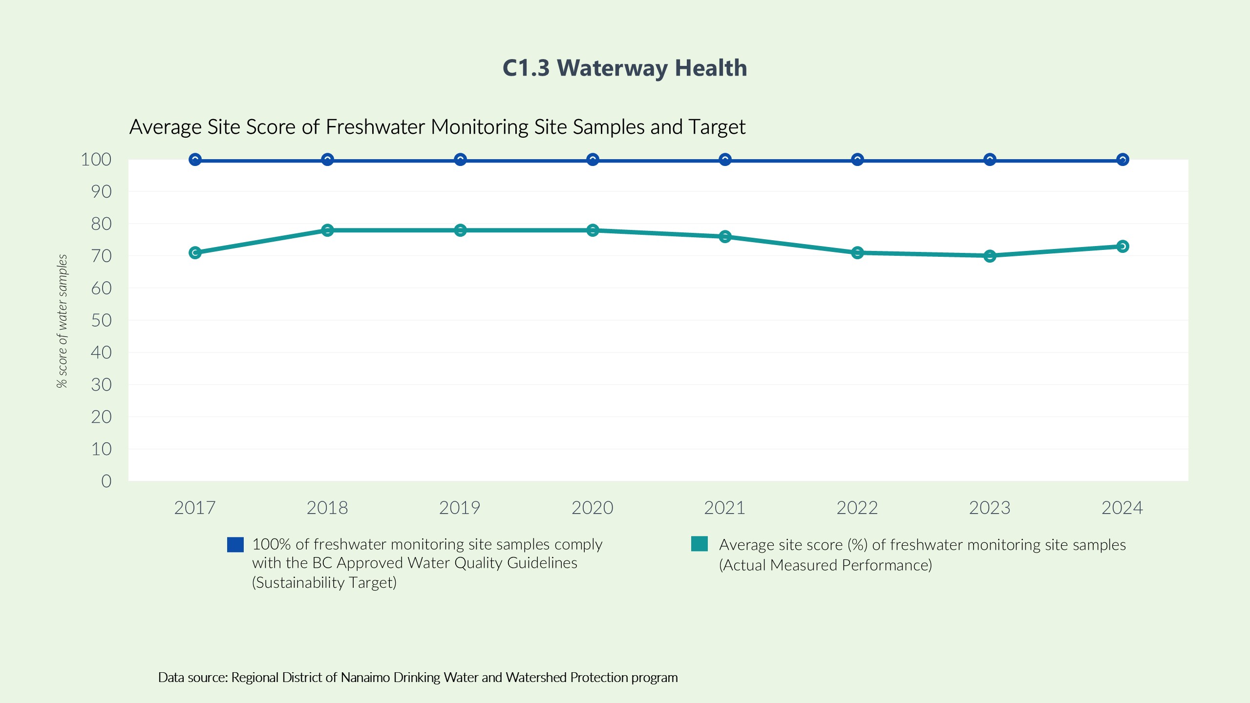 100% of water samples at select freshwater monitoring sites within and near the city comply with the applicable BC Approved Water Quality Guidelines and are not degrading.Metric