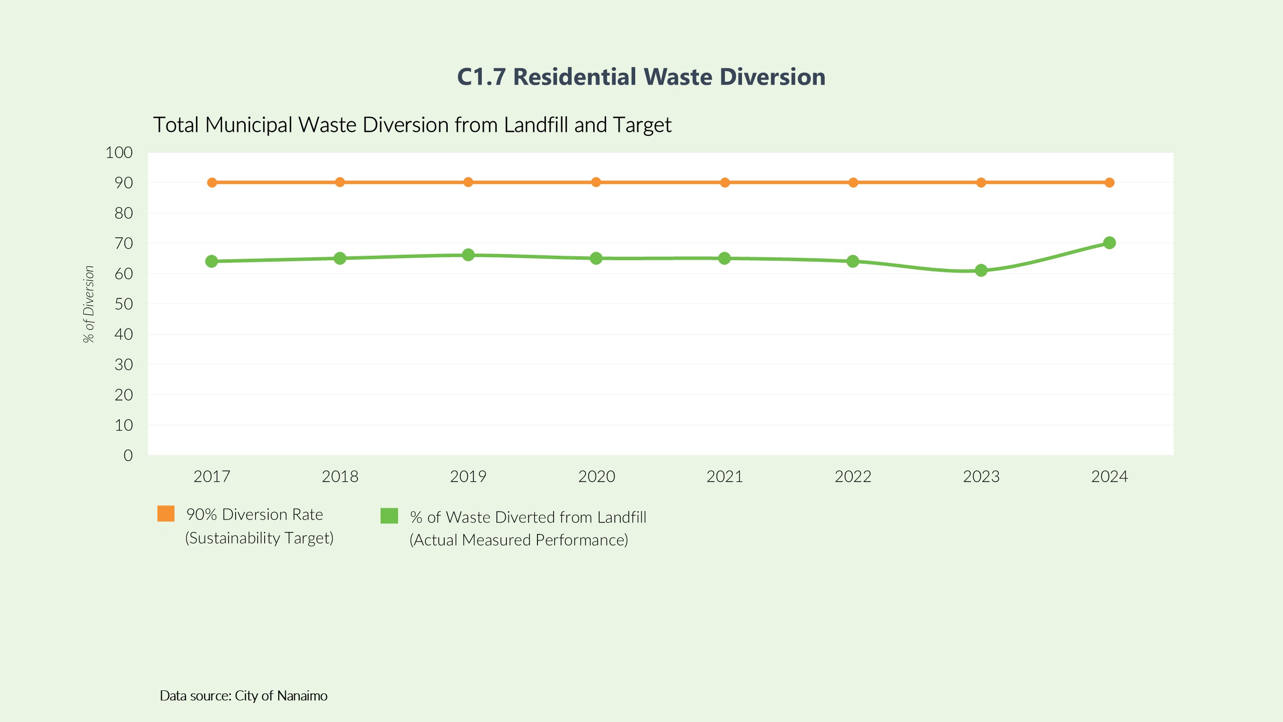 If the residential waste diversion rate of a particular year is 65%, then the score is 65%/90% = 72%.Indicator Data