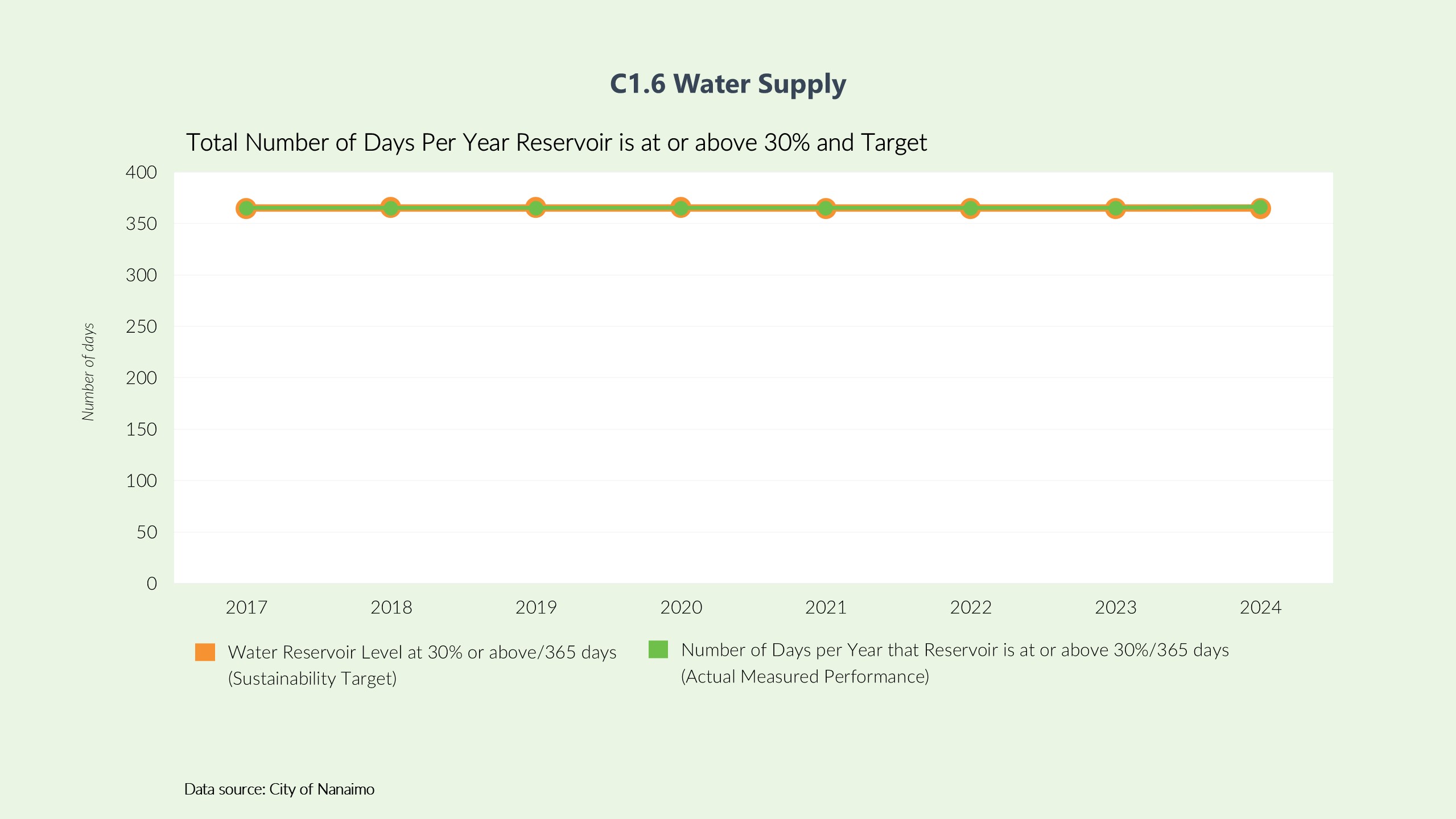 If the water level is at or above 30% every single day of the year, that means there are 365 days that meet the minimum threshold. So the score is 365 days/365 days = 100%.Indicator Data
