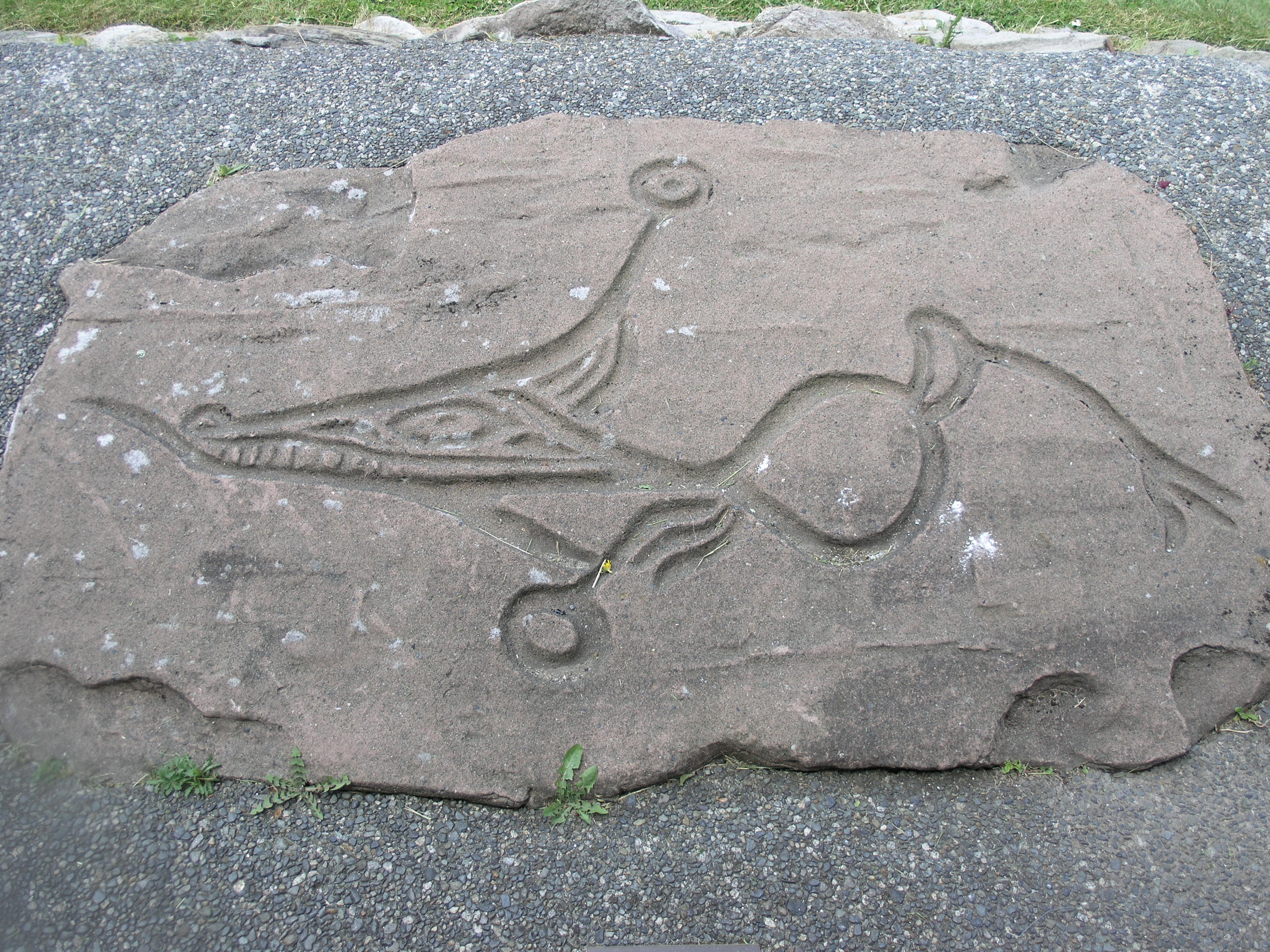 Twelve replicas of regional petroglyphs are carved in sandstone, installed along the sidewalk around the Nanaimo Military Museum. The original petroglyphs are located at several different locations on Vancouver Island: Sproat Lake, Cedar by the Sea, Holden Lake, Englishman River, Petroglyph Park, Harewood area, Ladysmith area, Yellow Island, and Kulleet Bay. Names were given to describe the petroglyphs based on imagined interpretations of what they might represent, though these names have no association with the originally intended meanings of the carvings.
