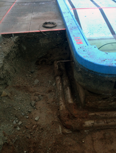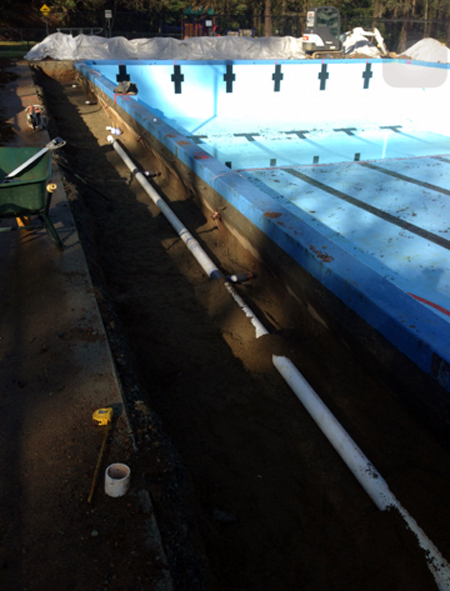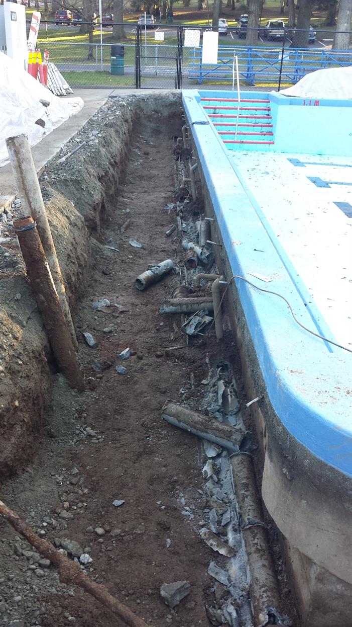 The original piping was made up of ACM (Asbestos containing materials) and had to be properly removed and disposed of. Then the new piping made of Polyvinyl Chloride (PVC) was installed and pressure tested for leaks. Once that was complete, grounding cables were installed - these help to ground any lightning strikes that may occur - and cement was poured. Crews were lucky to have some dry days to get this project completed in time to prep the pool for the upcoming Nanaimo White Rapids swim season.