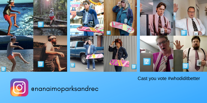 Have you been voting on the "Who Did it Better" series found on the Nanaimo Parks and Rec Instagram? Each week Recreation Coordinators re-create a famous movie scene for followers to vote on who did it best! If you're looking for something fun to follow, check it out.