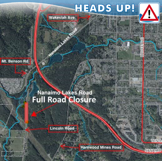- Nanaimo Lakes Road closed 24 hours per day between Mt. Benson Road and Lincoln Road until further notice.