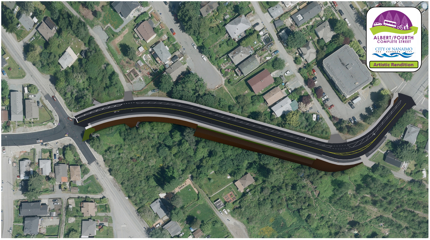 - Continuation of the VIU Bikeway on Albert Street from Pine Street to Milton Street including widening of Albert Street between Pine Street and Kennedy Street to facilitate the installation of concrete sidewalks, concrete curbs, cycling facilities, and street lighting.