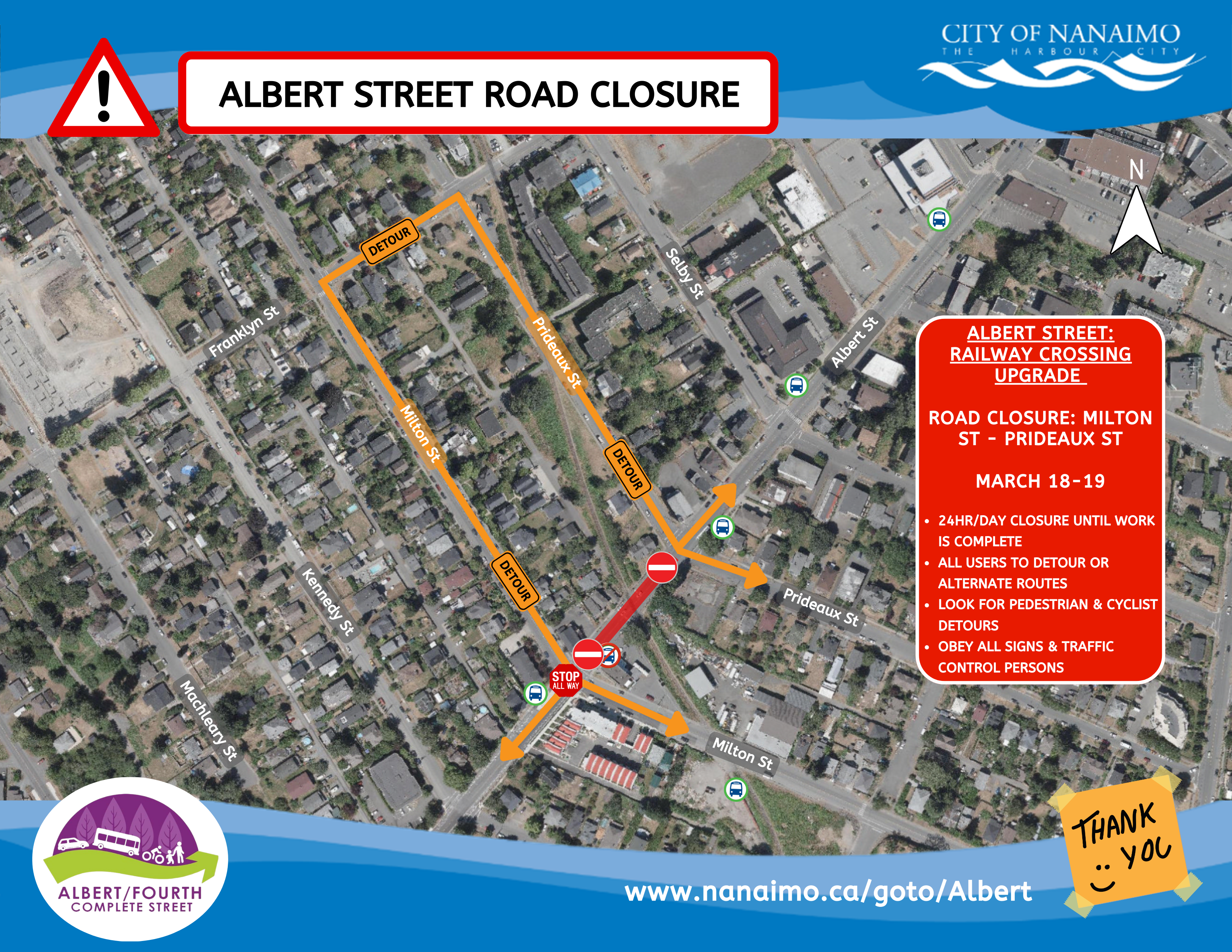 ROAD CLOSURE: Albert Street will be closed between Milton Street and Prideaux Street from March 18 to March 19, 2026, to facilitate a railway crossing upgrade (Detour Map). The work will be undertaken by Milestone Equipment Contracting, Amrize, and the Southern Railway of Vancouver Island and has been coordinated with the ongoing Albert Street construction to minimize overall disruption. The closure will be in effect 24 hours/day for the duration of the work, as the rail crossing will be impassable during construction.