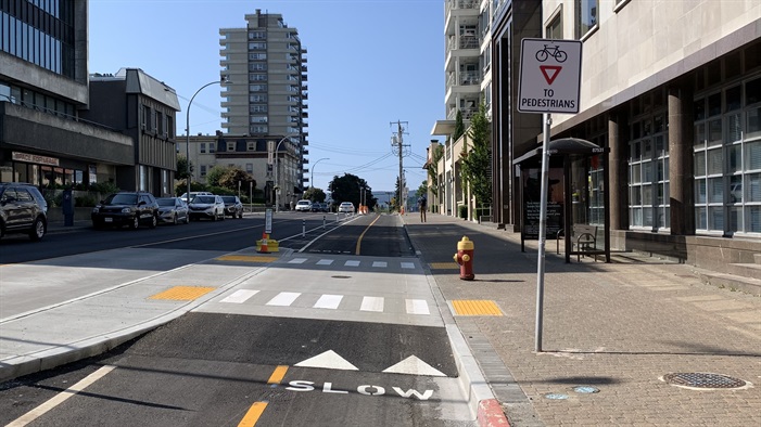 The protected two-way cycle track is one of the short-term cycling priorities identified in the Nanaimo Downtown Mobility Hub Project, which will advance the vision of an integrated downtown transportation network that safely and comfortably accommodates pedestrians, cyclists, transit users, goods movement, and motorists.