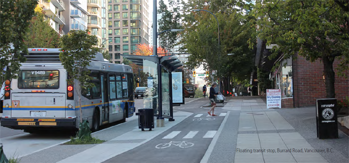 A4. Existing transit stop locations within the project area will generally be the same as they are today. Transit stops on the east side of Front Street that are adjacent to the new cycle track will include ‘floating bus stops’. In this design, the bus will stop at a raised concrete island, and the cycle lanes will detour behind the island and between the island and the pedestrian sidewalk. This design provides a protected space for cyclist to bypass both buses and passengers while they load and unload the bus. The crossing between the sidewalk and transit island will be the same elevation to allow for easy crossing for bus users and to slow down cyclists. The crossings will include walking surface indicators used to alert passengers, and particularly passengers with visual impairments, that they are approaching an area that is used by a different mode (ie the cyclists). Floating transit stops are the preferred treatment for transit stops along corridors with bicycle facilities according to the BC Active Transportation Guide. See example picture below.