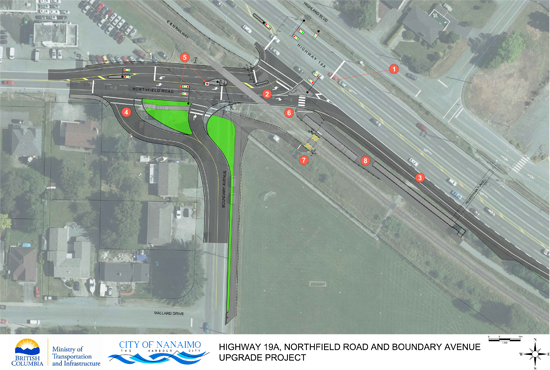 The intersection(s) of Northfield Road/Boundary Avenue and Highway 19A/Northfield Road has long been an area of concern due to the high number of vehicle collisions. A traffic study in 2009 and following the recommendations of that study, in 2011, the City of Nanaimo, in partnership with the Ministry of Transportation and Infrastructure, engaged Stantec Consulting Ltd. to re-design the intersection with the primary objective of improving safety for all modes of transportation. The project was originally scheduled to be constructed in 2014; however, a project funding shortfall of $800,000 stalled the project. The design was revisited and a value engineering review was completed before it was Tendered in 2016. The project tender was cancelled and the project was postponed again due to the uncertainty of the future use of the railway and the $1,000,000 expense to upgrade the rail network for passenger service. The rail component of the project was then re-negotiated with the rail stakeholders to include half of the rail upgrade to occur at time of construction and the other half to be completed prior to implementation of rail passenger service. The storm and sidewalk on Northfield Road from Boundary Avenue to Duggan Road (originally scheduled for 2019) was added to the Intersection Upgrade Project and the project was tendered in 2017 with construction planned for 2018.